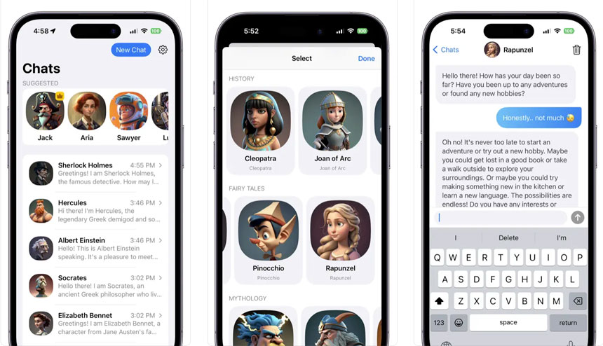 The app is structured like a messaging app, allowing users to have multiple conversations with different AI chatbots at the same time.