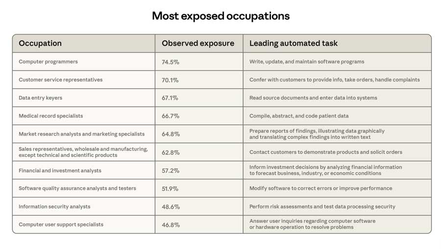 The top ten most exposed occupations under Anthropic’s measure show that Computer Programmers are at the top, with 75% coverage, followed by Customer Service Representatives. Finally, Data Entry Keyers, whose primary task of reading source documents and entering data is significantly automated, are 67% covered.