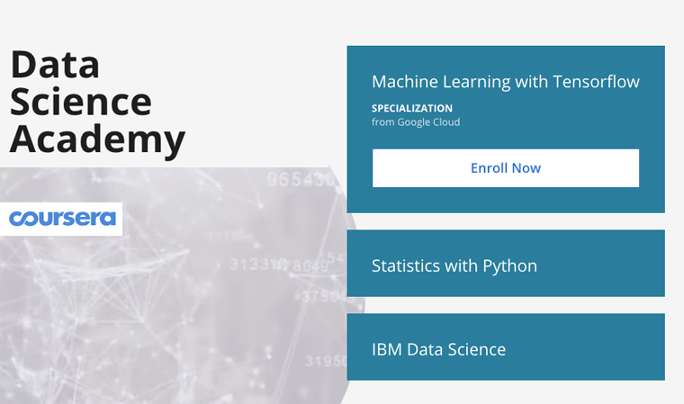 Coursera launched this month a new vertical called Data Science Academy to help professionals find data science-related courses on R, Python, SQL, SAS, Java, and other skills.