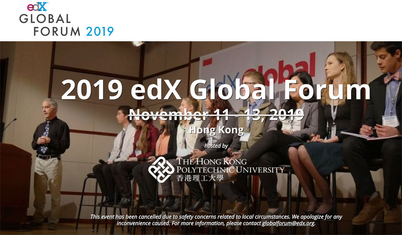 The annual edX Global Forum partners conference, that scheduled this year in Hong Kong for November 11-13, was canceled due to “safety concerns related to local circumstances”, organizers say.