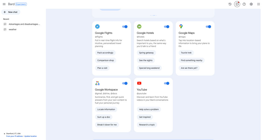 - The new Bard can now retrieve and help users work with real-time info from Maps, YouTube, Hotels, and Flights, extensions that don’t leverage personal data. These extensions are enabled by default, and you can disable them at any time.