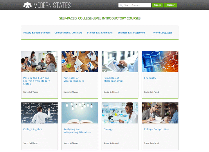ModernStates.org classes are high-tech recorded sessions taught by professors from schools such as Johns Hopkins University, Rutgers University, and George Washington University, and prepare learners to pass a CLEP exam. Course materials include free online textbooks and readings, plus practice questions from the College Board. Students can study each course at their own pace and take the CLEP exam when they feel ready.