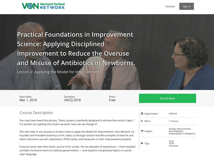 The Open edX software-based Vermont Oxford Network (VON), a nonprofit collective of multidisciplinary medical professionals founded in 1998, has developed a uniquely collaborative, evidence-based learning network among clinicians of over 1000 neonatal intensive care units and hospital nurseries around the world.