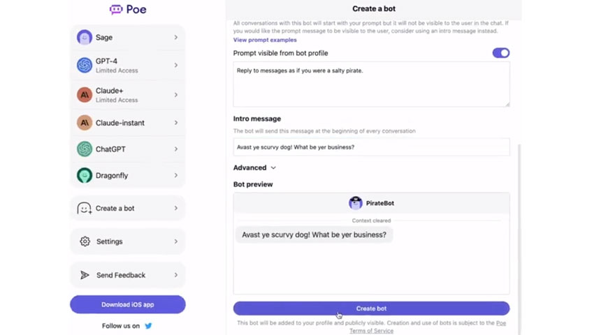 We are launching a new feature on Poe today: user-created bots. This initially allows anyone to create a new bot based on a short text prompt and an existing bot used as a base. We currently support Claude instant and ChatGPT as base bots. pic.twitter.com/Fr2Leoum8v