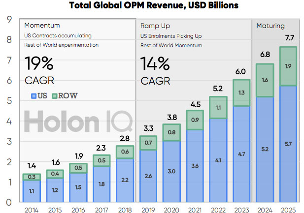 The Online Program Manager (OPM) business, with 60+ providers in a $3B+ market growing at 17%, will reach $7.7B by 2025, according to research by HolonIQ. Increased interest from learners, more offerings from colleges, and wider acceptance from employers will boost this growth.