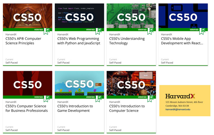 • CS50 Computer Science courses. Since its creation in 2012, this collection has over one million users. Two modules, understanding technology and computer science for business professionals, were added this year.